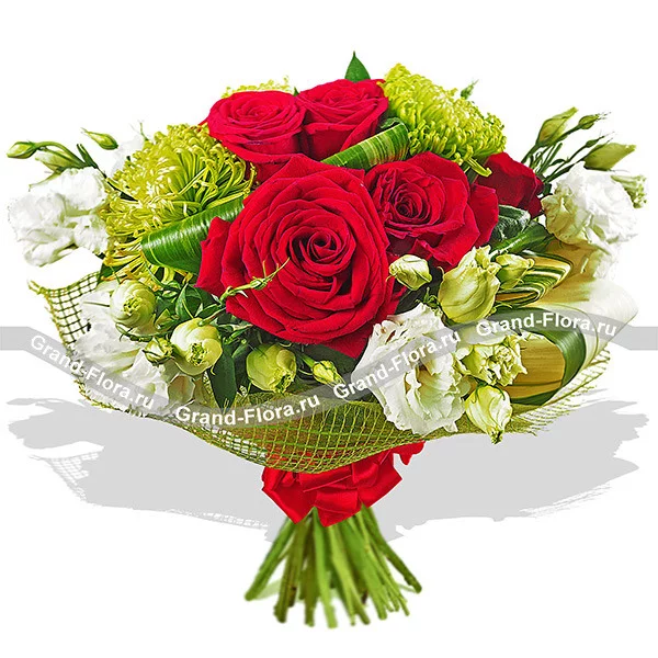 Стандартный (на фото): роза красная - 5 шт, хризантема одноголовая зеленая - 4 шт, эустома белая - 4 шт, лист аспидистры загнутый - 5 шт, сетка зеленая. Примерный размер: 25Х25 см.