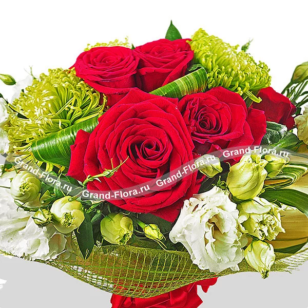ДЕЛЮКС: роза красная - 19 шт, хризантема одноголовая зеленая - 12 шт, эустома белая - 10 шт, лист аспидистры загнутый - 8 шт, сетка зеленая. Примерный размер: 45Х45 см.