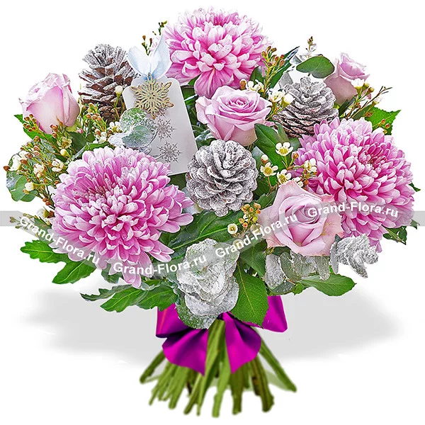 Люкс: хризантема одноголовая фиолетовая - 5 шт., роза Аква - 4 шт., эвкалипт декорированный серебром) - 3 шт., рускус - 3 шт., шишки (декорированные серебром) - 2 шт., бант фиолетовый.