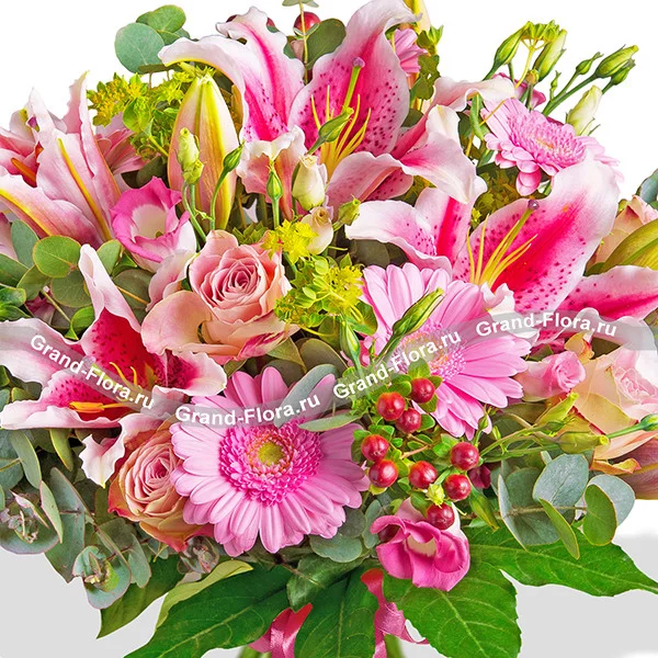 ДЕЛЮКС: лилия розовая - 5 шт., роза розовая - 11 шт., гербера розовая - 7 шт., эустома розовая - 4 шт., гиперикум красный - 5 шт., эвкалипт - 5 шт., рускус - 5 шт., бант розовый.