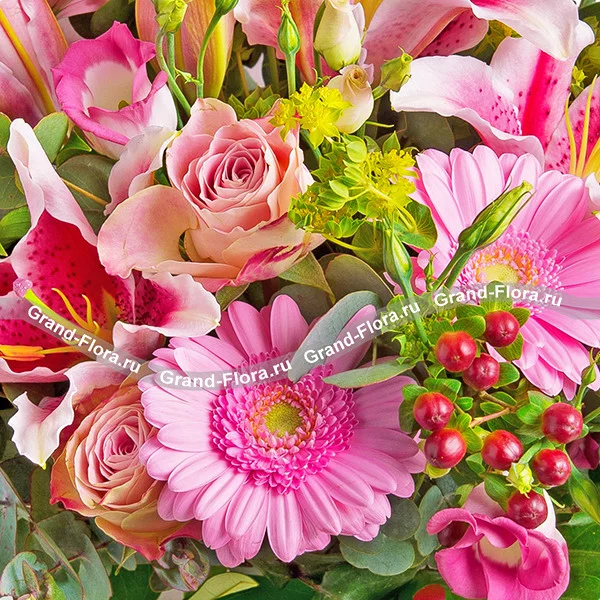 Феерический микс в розовых тонах, наполненный изысканными акцентами лилий, чувственными розами, эустомами и мажорными нотами гербер , создает настоящее музыкальное произведение, подобное самым романтичным мелодиям, воплощенным в этом букете.