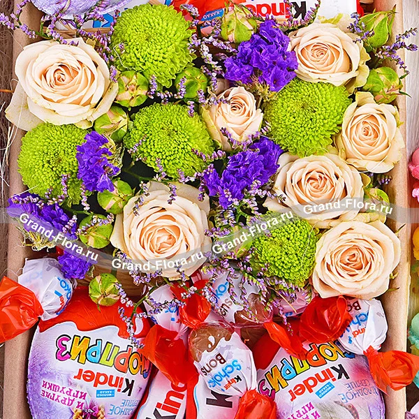Стандартный: роза кустовая белая 2 шт., хризантема кустовая зелёная  - 1 шт., статица - 2 шт., макаруны., киндер сюрприз яйцо - 3 шт., киндер шоколад., киндер choco bons., послания в письме., оазис ., коробка.