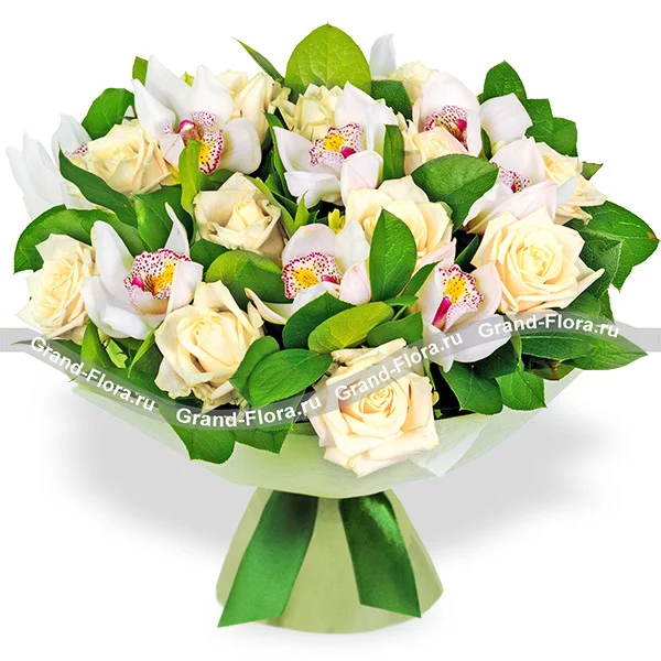 Нежный букет из роз и орхидей символизирует искренность чувств и душевную чистоту! Эти цветы станут символом долгой и счастливой жизни!