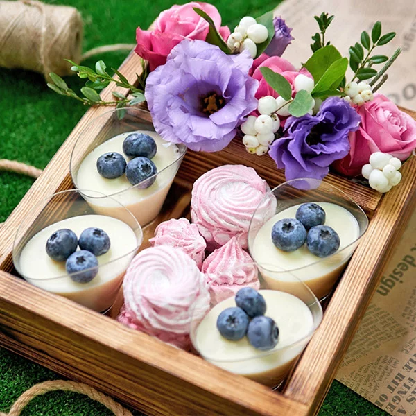 Стандартный: роза розовая - 3 шт., эустома фиолетовая - 1 шт., декоративная зелень, зефир, десерт в стакане - 4 шт., оазис, деревянная коробка.