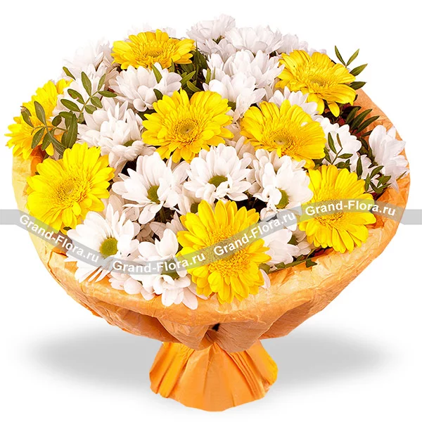 Стандартный (на фото): хризантема кустовая белая - 7 шт., гербера желтая - 8 шт., декоративная зелень, упаковка, лента. Примерный диаметр букета 30х30 см.