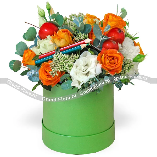 Стандартный: роза оранжевая - 9 шт., эустома белая - 2 шт., декоративная зелень., декор (карандаши, мини яблоки)., оазис, коробка.